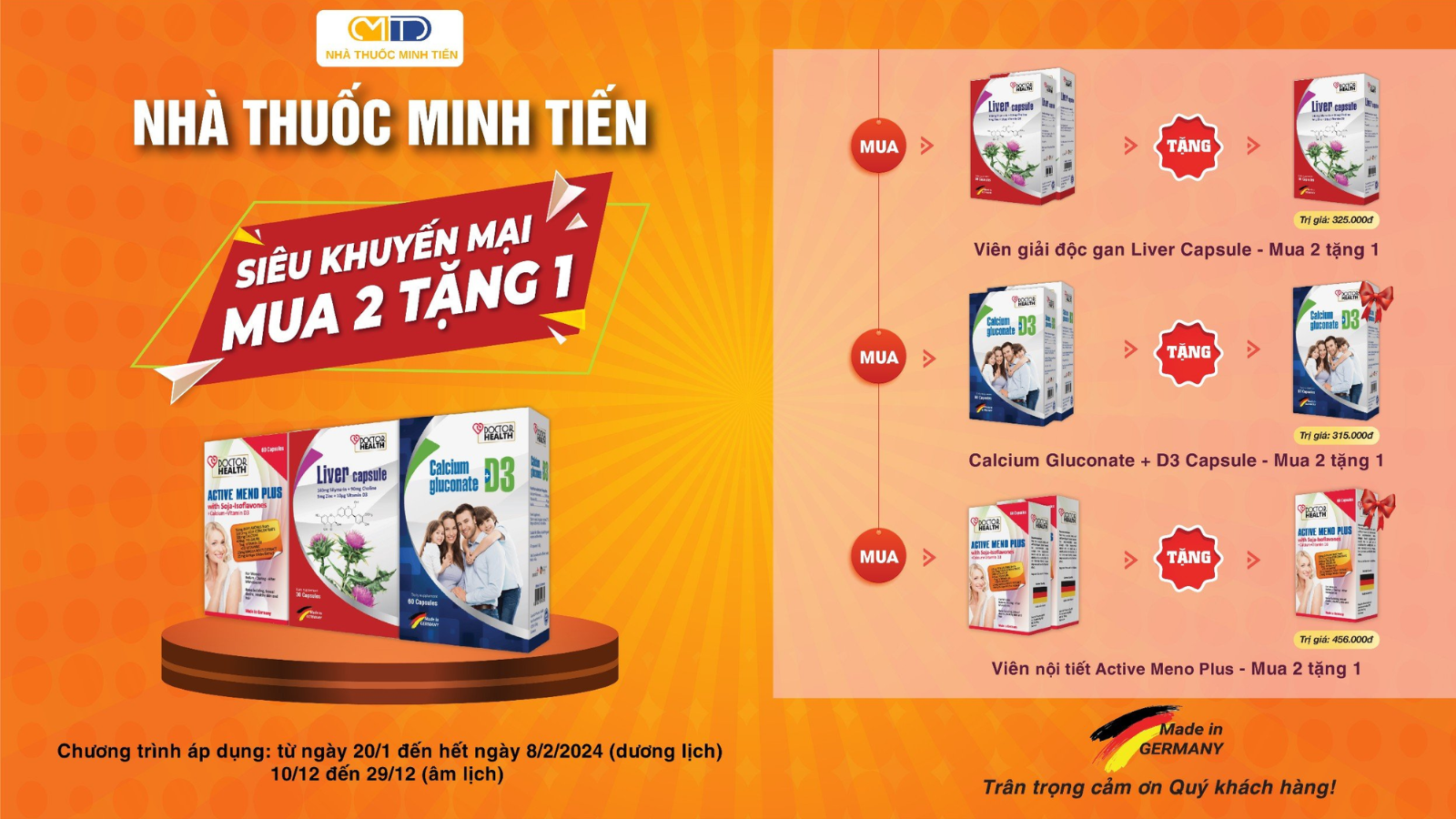 🌸 Giai đoạn chuyển giao từ năm cũ qua năm mới là thời điểm tuyệt vời để chăm sóc sức khỏe và bắt đầu một cuộc sống mới đầy năng lượng. Để tri ân khách hàng thời gian qua đã luôn ủng hộ, Nhà Thuốc Minh Tiến tự hào giới thiệu chương trình “Siêu khuyến mãi mua 2 tặng 1” cực kỳ hấp dẫn! 🎁🎉