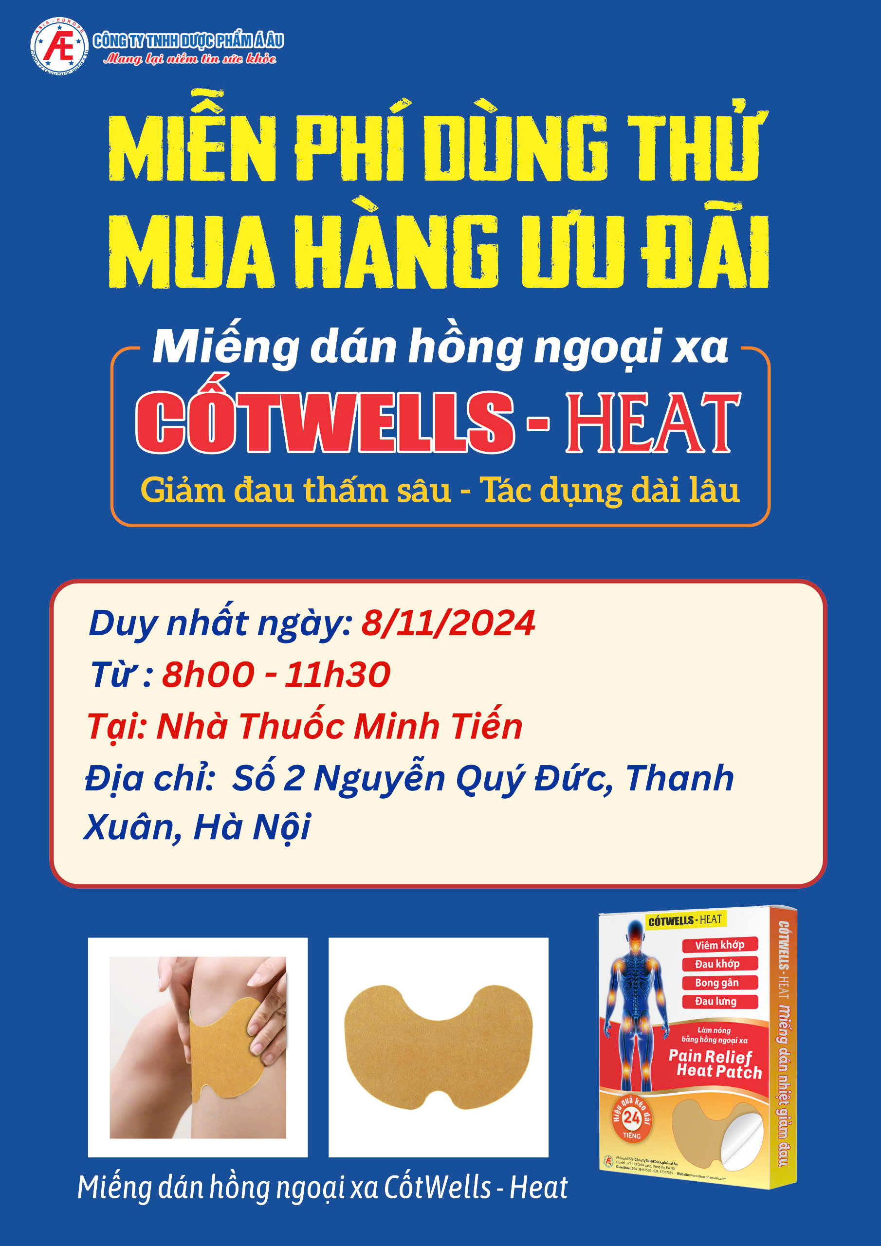 Nhà thuốc Minh Tiến kết hợp với công ty TNHH Dược Phẩm Á Âu tổ chức chương trình trải nghiệm sản phẩm Miếng dán hồng ngoại xa CốtWells – Heat, giảm đau thấm sâu, tác dụng dài lâu.