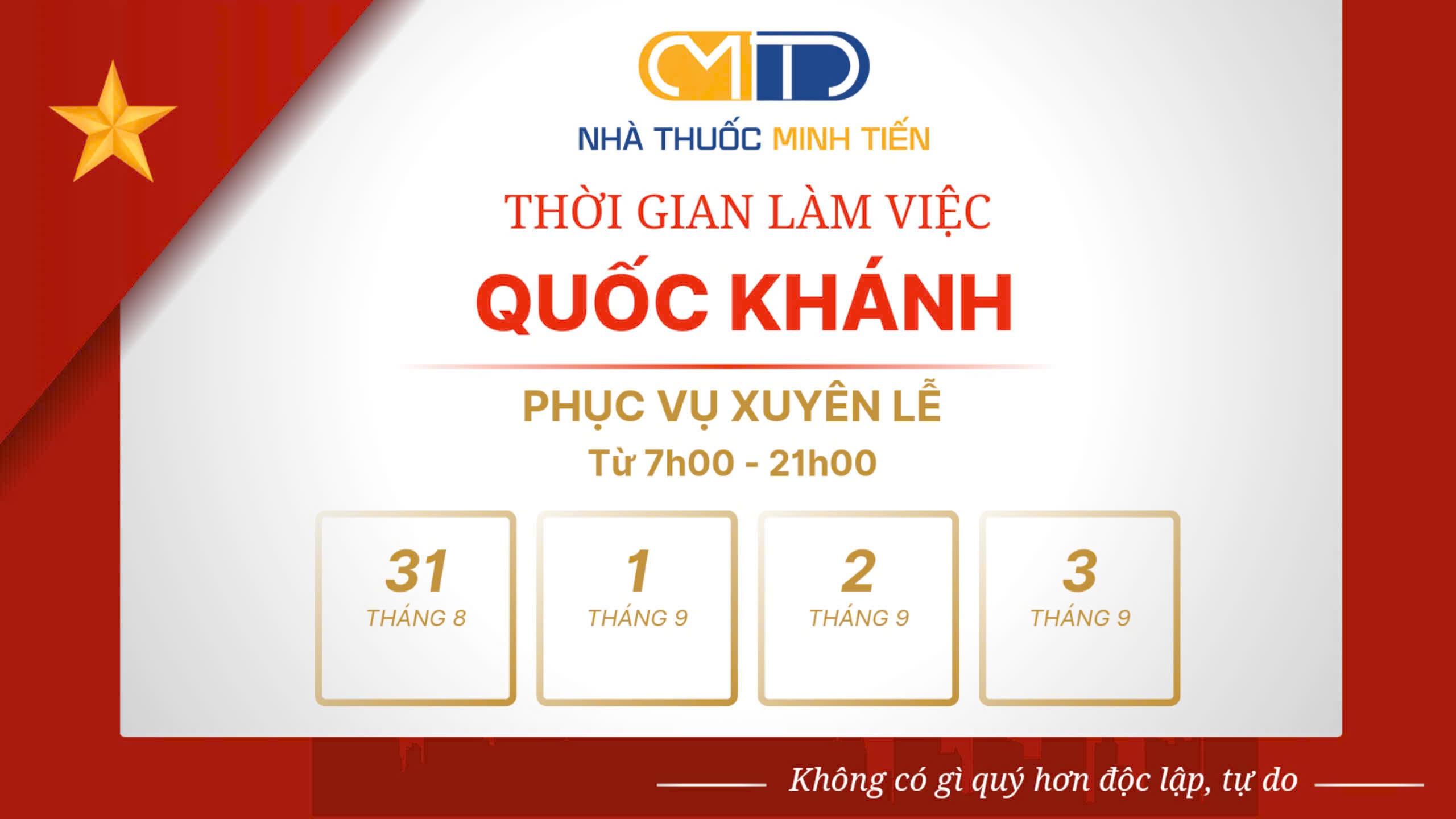 Nhà thuốc Minh Tiến xin gửi lời chúc mừng đến toàn thể quý khách nhân dịp Lễ Quốc Khánh 2/9.
