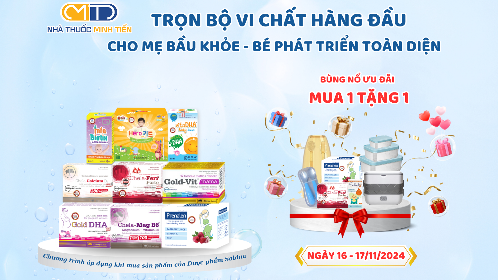– Tặng 01 hộp Prenalen (trị giá 140K) hoặc ½ hộp Chela-Ferr Bio Complex (trị giá 150K) và Hộp cơm giữ nhiệt cắm điện (trị giá 350k) với đơn hàng từ 1tr500k.